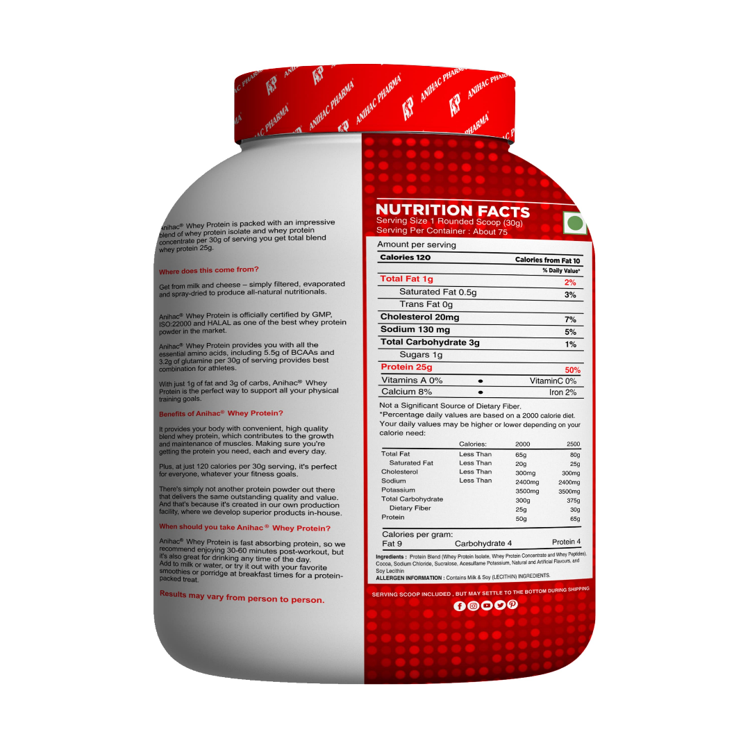 ANIHAC Whey Protein 5lb (2.27 kg) workout nutrition contains Whey Protein isolate and concentrate. It is packed with an immersive blend of whey protein isolate and whey protein concentrate per 30gm of serving, you get a total blend of whey protein of 25gm. It provides a very needed amount of protein to your body to boost or lean your muscles, essential nutrients that help in muscle recovery and performance, and don’t worry about the taste, it comes in ultra-premium chocolate flavor.