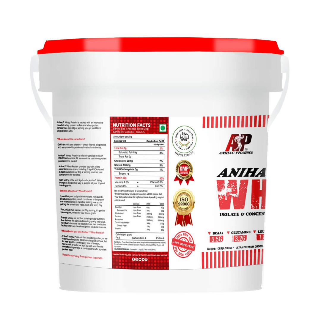 ANIHAC Whey Protein 10lb (4.35kg) workout nutrition isolate and concentrate which contains Protein Supplement. It is packed with an immersive blend of whey protein isolate and whey protein concentrate per 30g of serving, you get a total blend of whey protein of 25g. It provides a very needed amount of protein to your body to boost or lean your muscles, essential nutrients that help in muscle recovery and performance, and don’t worry about the taste, it comes in ultra-premium chocolate flavor.